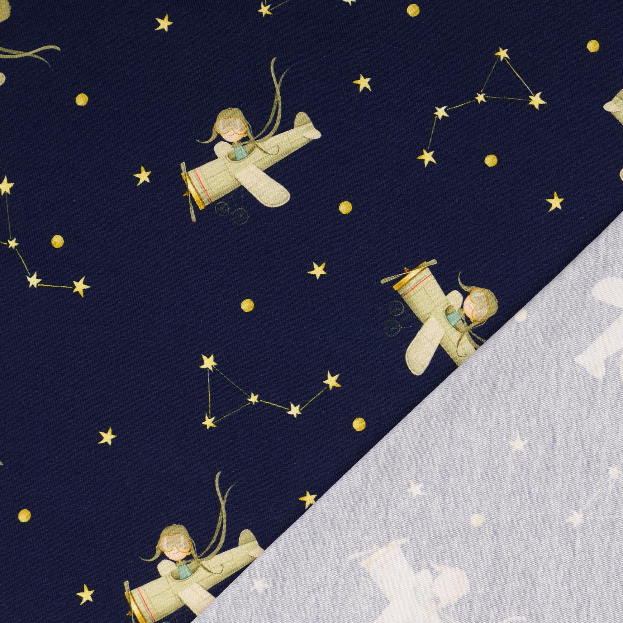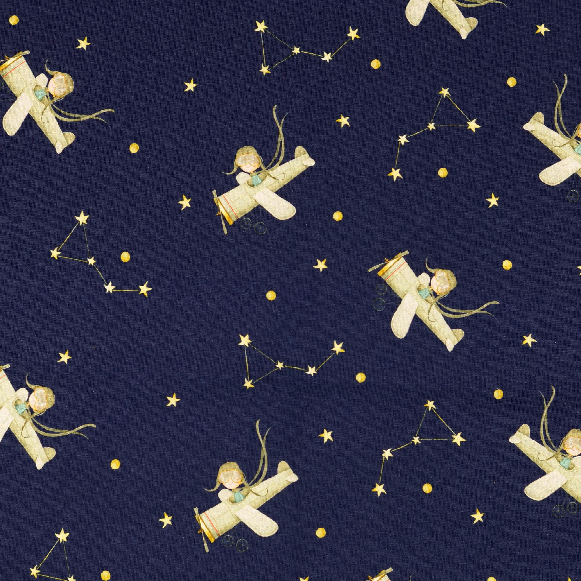 Produktinformationen "Baumwolljersey Little Darling "Sternenflieger" mit Sternen und Flugzeug - navy"