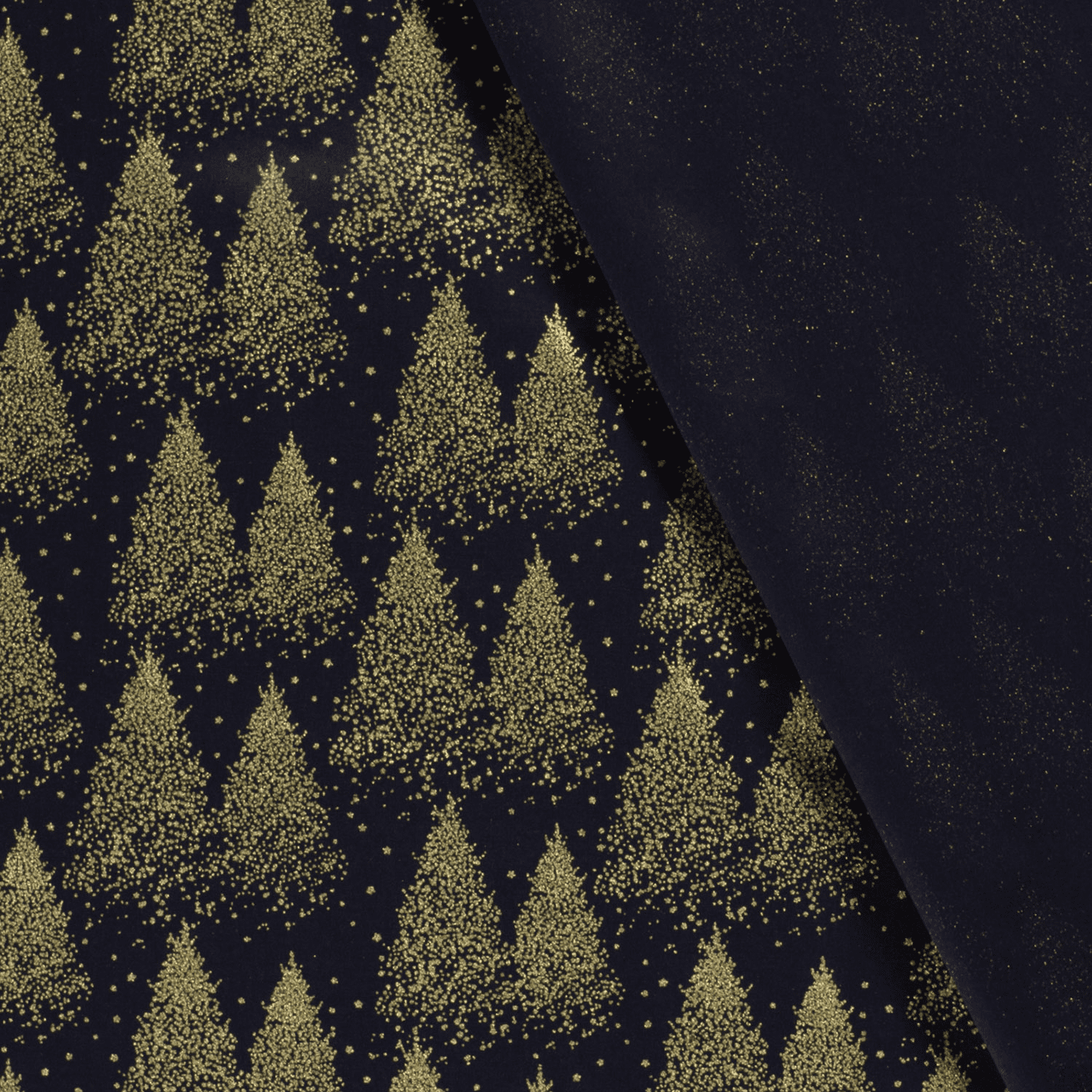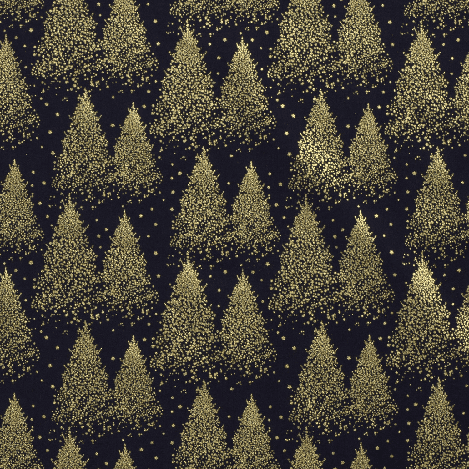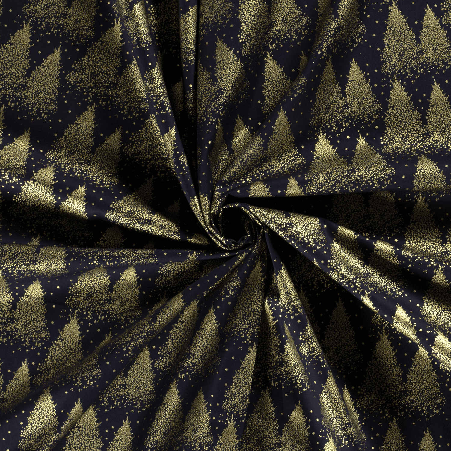 Baumwollstoff (Popeline) "Golden Forest" auf marine. Die goldenen Motive sind glänzend mit Foliendruck.