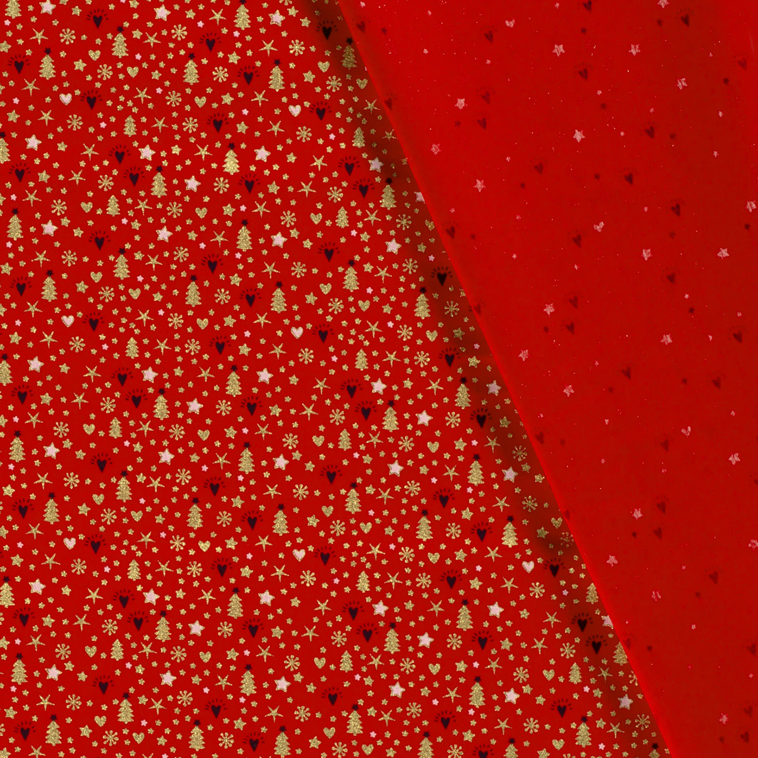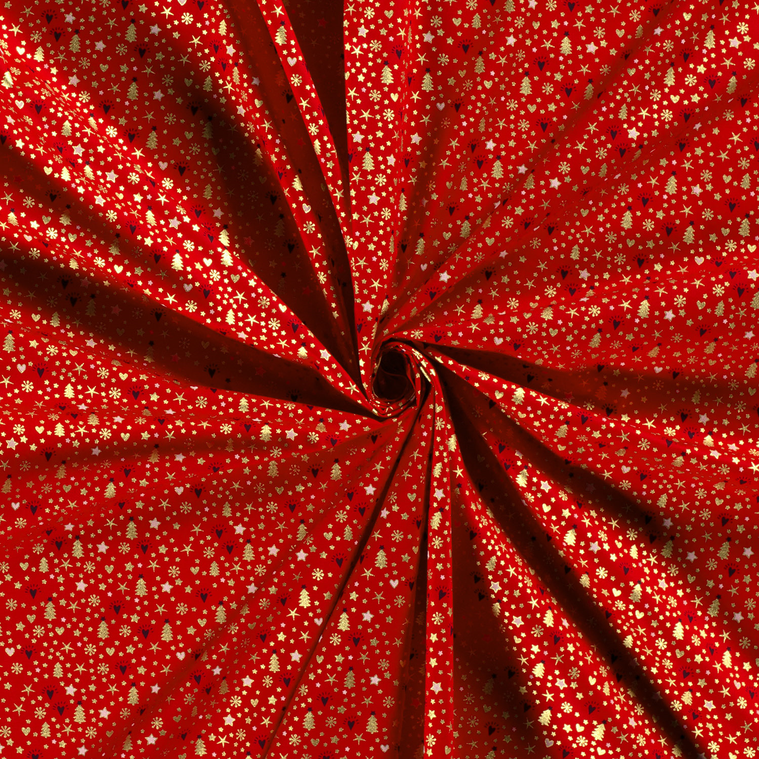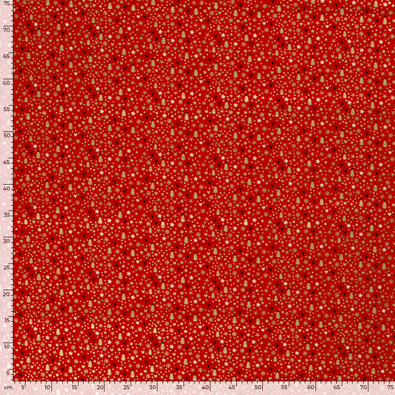 Baumwollstoff (Popeline) mit "Weihnachtszauber" mit Tannen, Herzen und Sternen auf rot. Die goldenen Motiven sind glänzend mit Foliendruck.