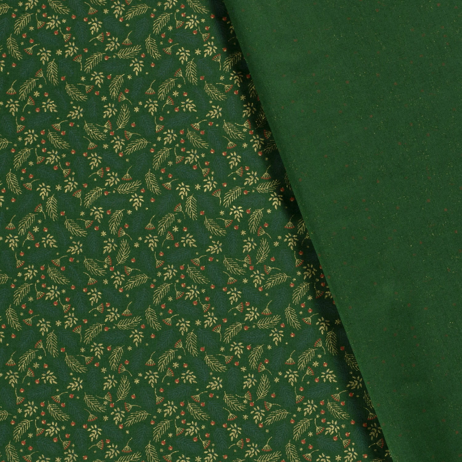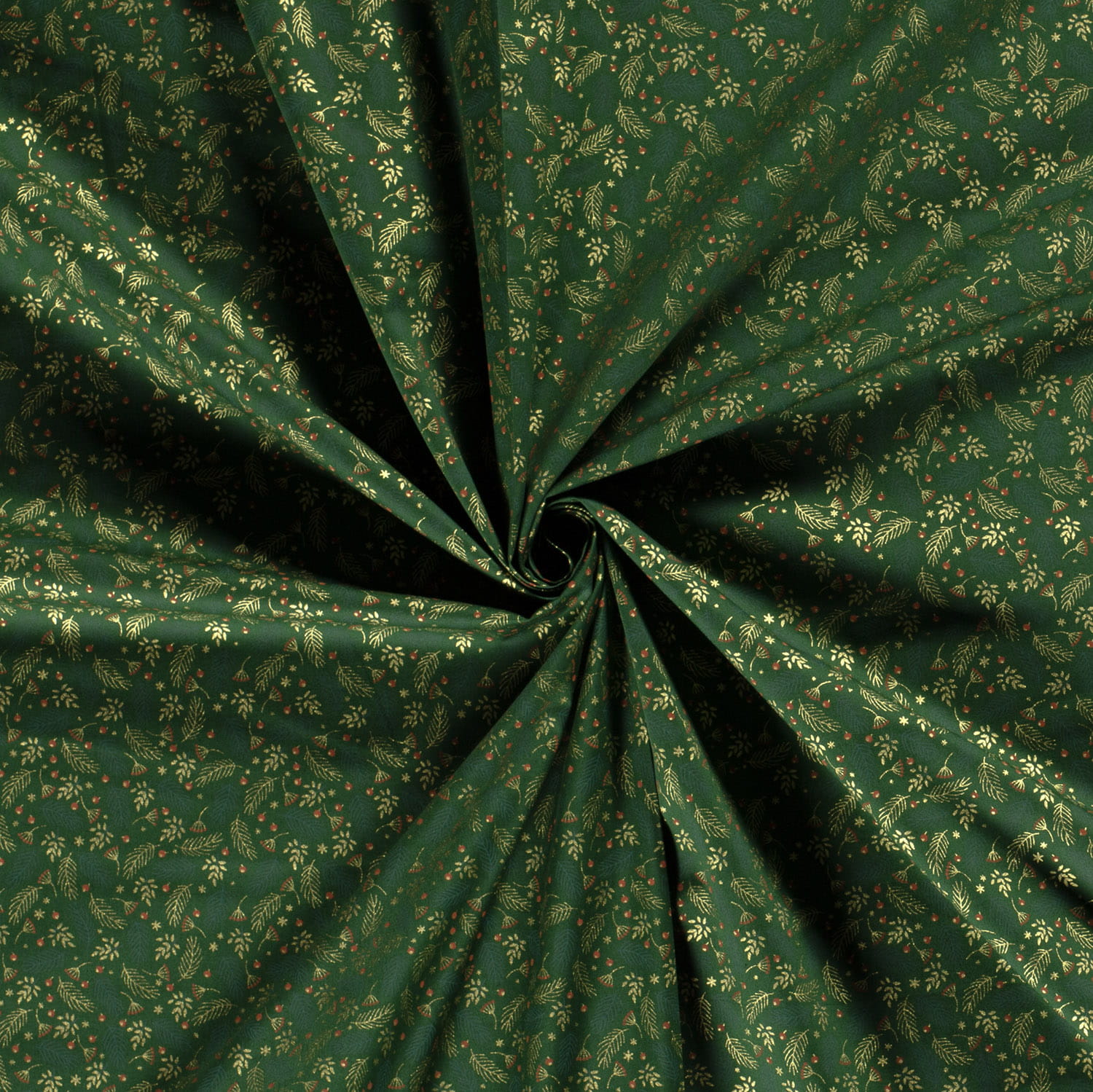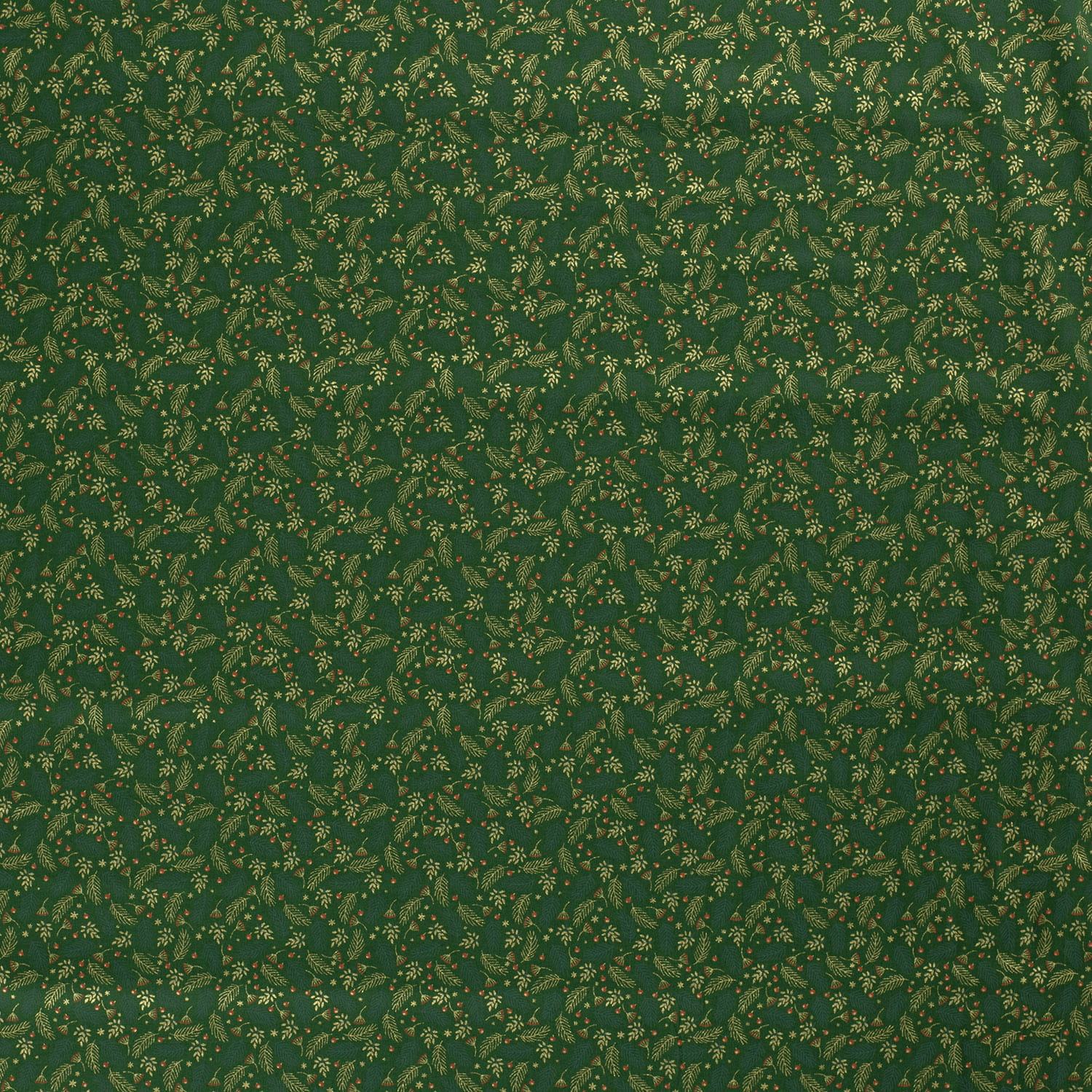 Baumwollstoff (Popeline) mit Weihnachtszweigen auf grün. Die goldenen Motive sind glänzend mit Foliendruck.