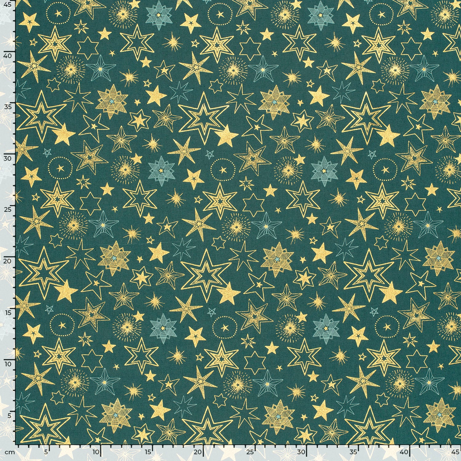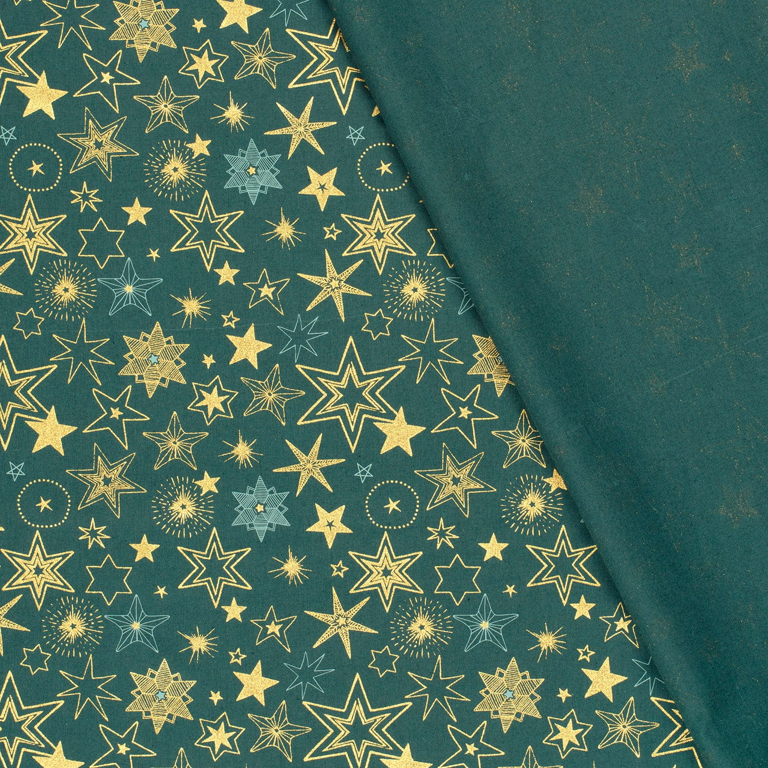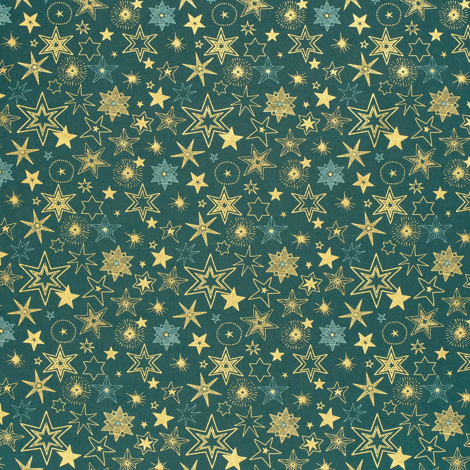 Baumwollstoff (Popeline) mit verschiedenen Sternen auf petrol. Die goldenen Motive sind glänzend mit Foliendruck.