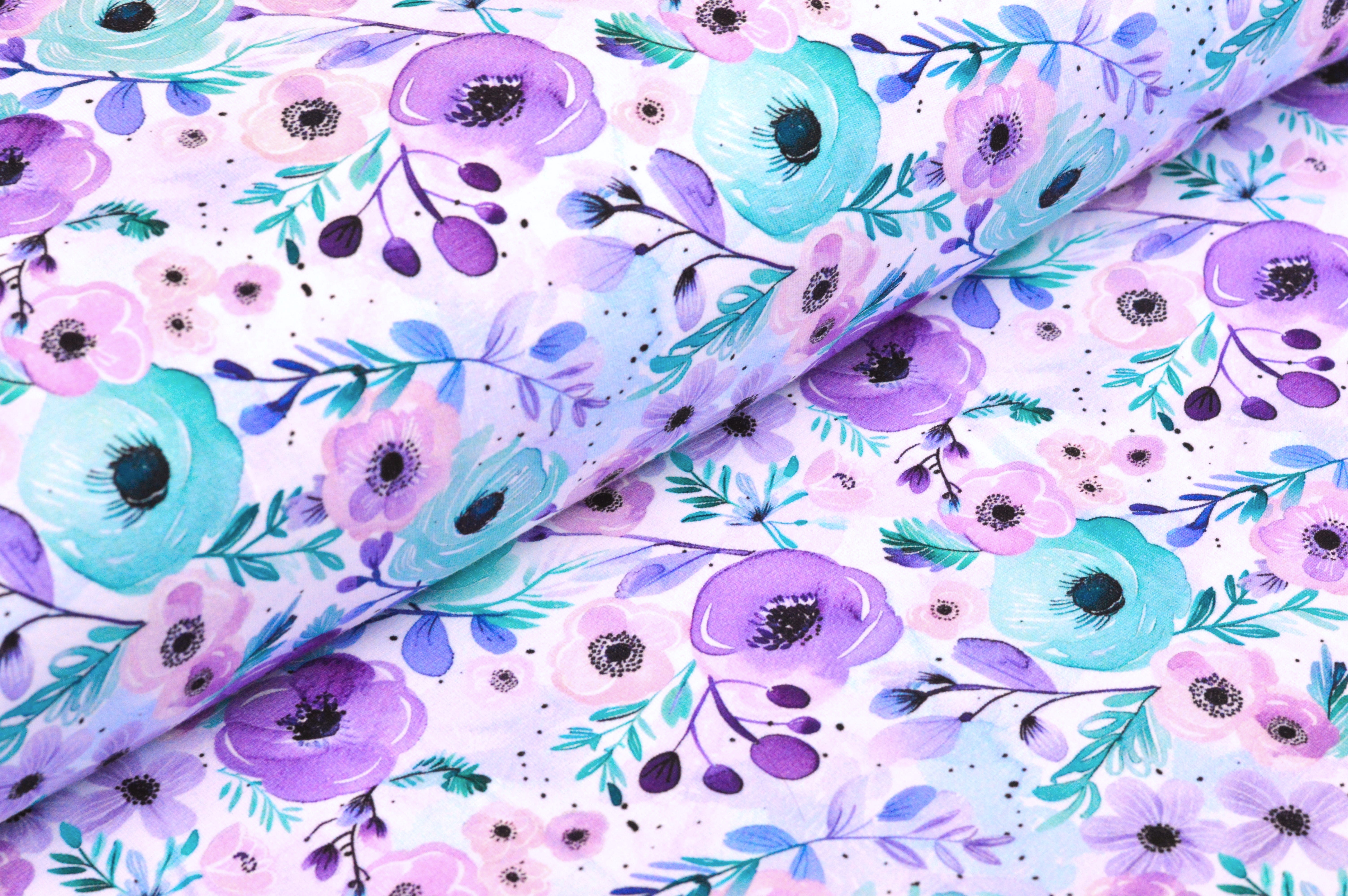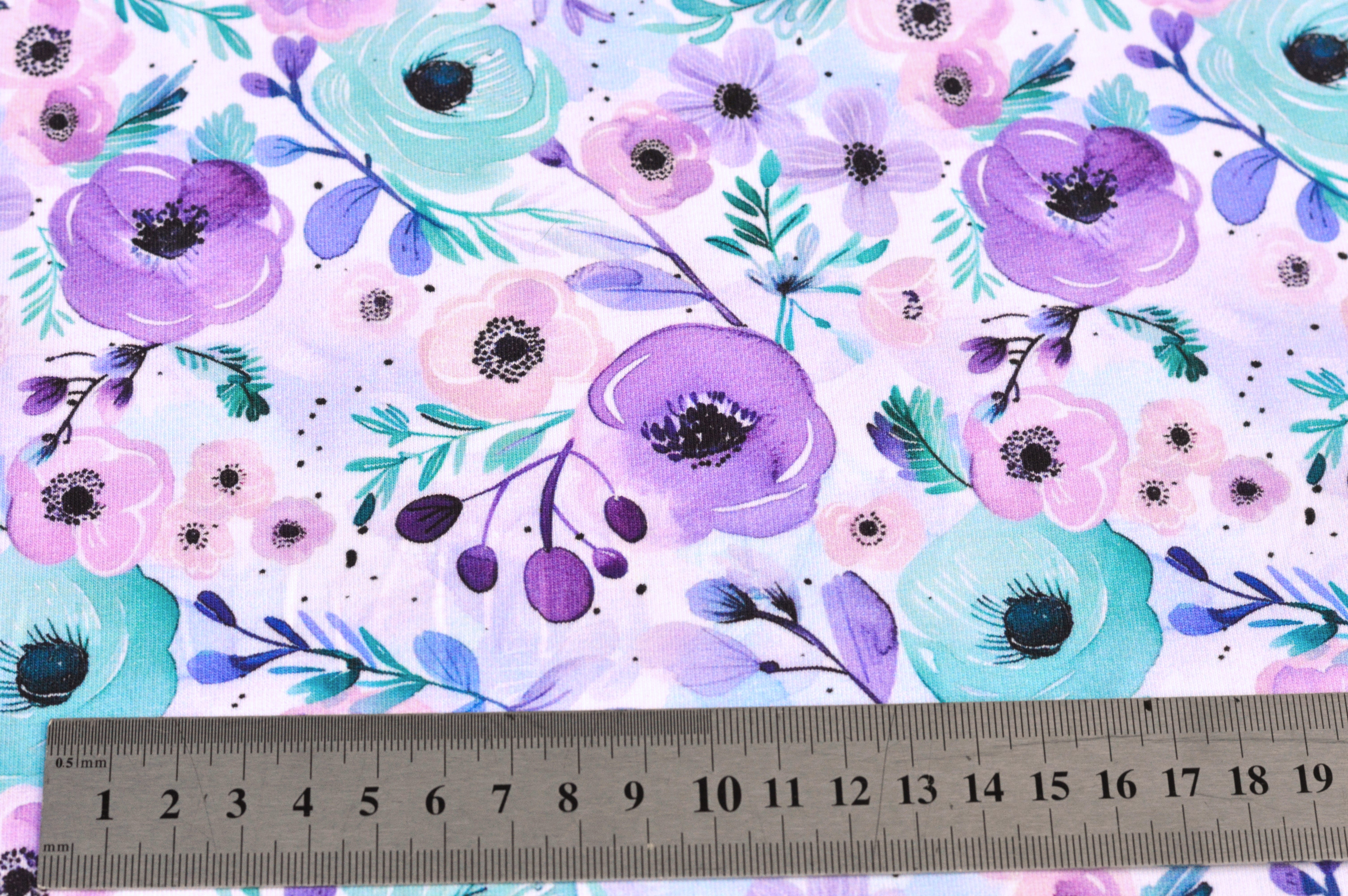 Digitaljersey Eigenproduktion "Blütenzauber" mit Blumen in in lila, rosa und mint auf weiß.Über uns
