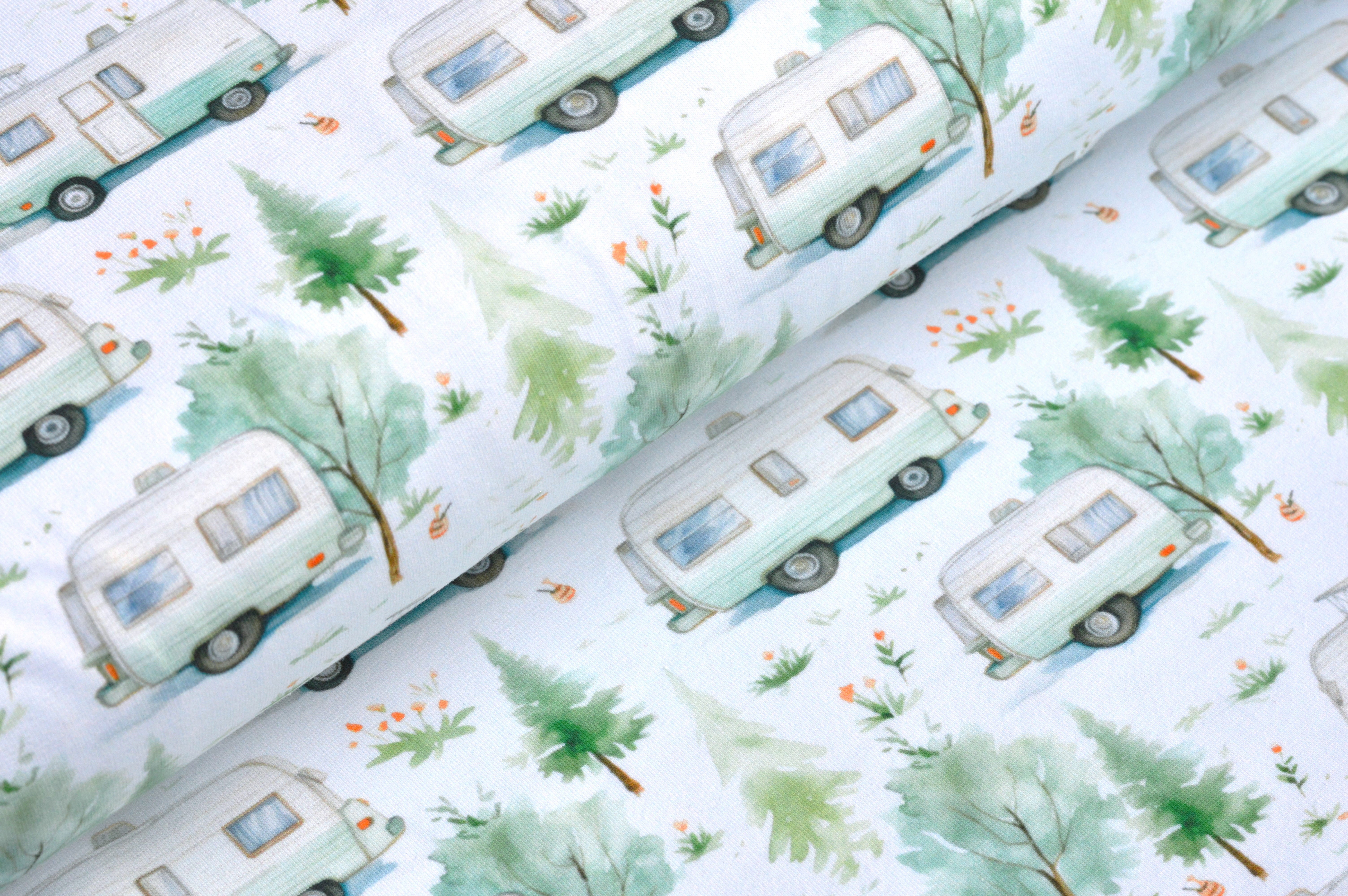 Digitaljersey Eigenproduktion "Camping Life" mit Bäumen und Wohnwagen auf weiß.Über uns