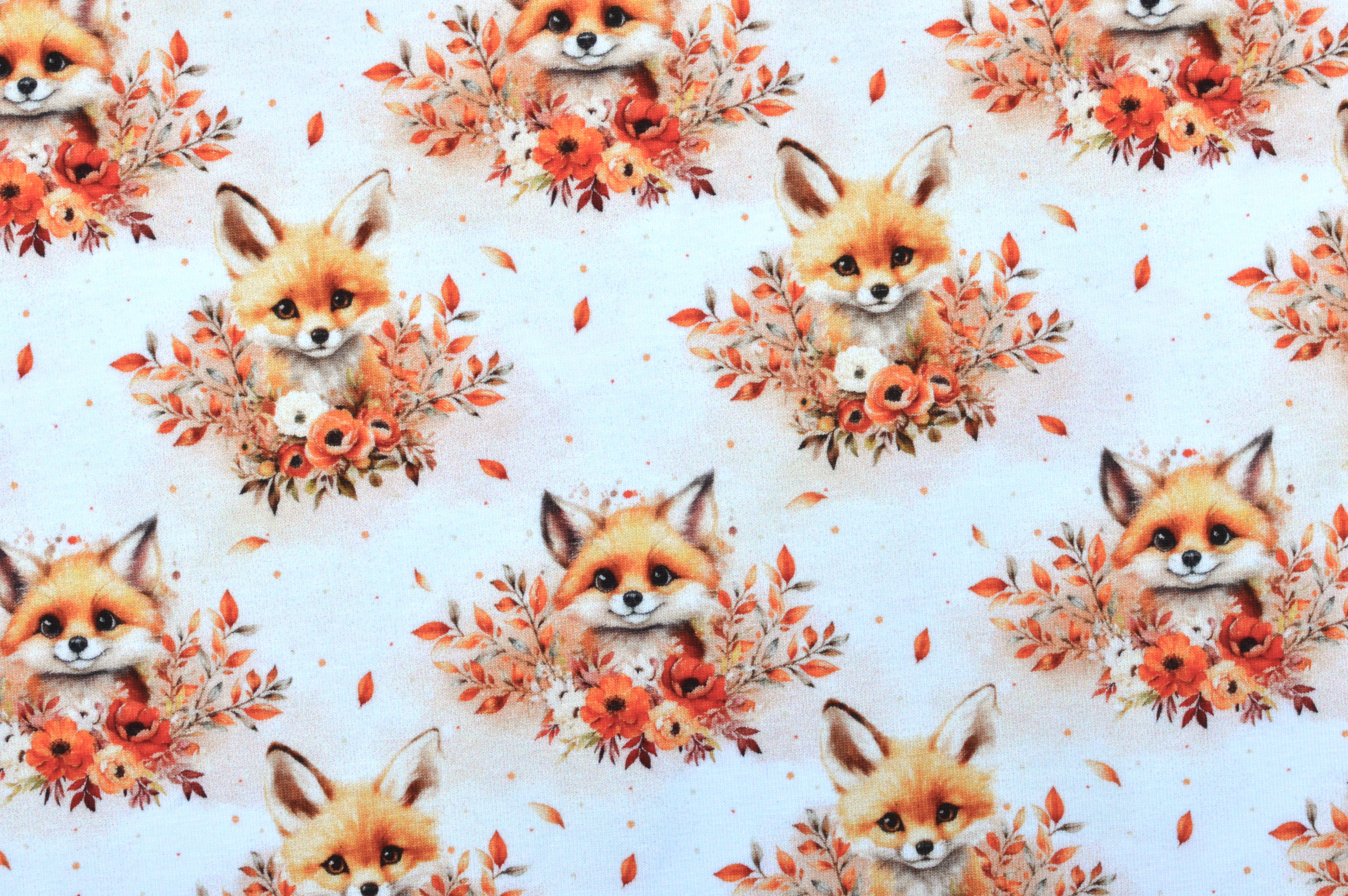Digitaljersey Eigenproduktion "Freddie Fuchs" mit Füchsen im Blumenkranz in ecru/orange.Über uns