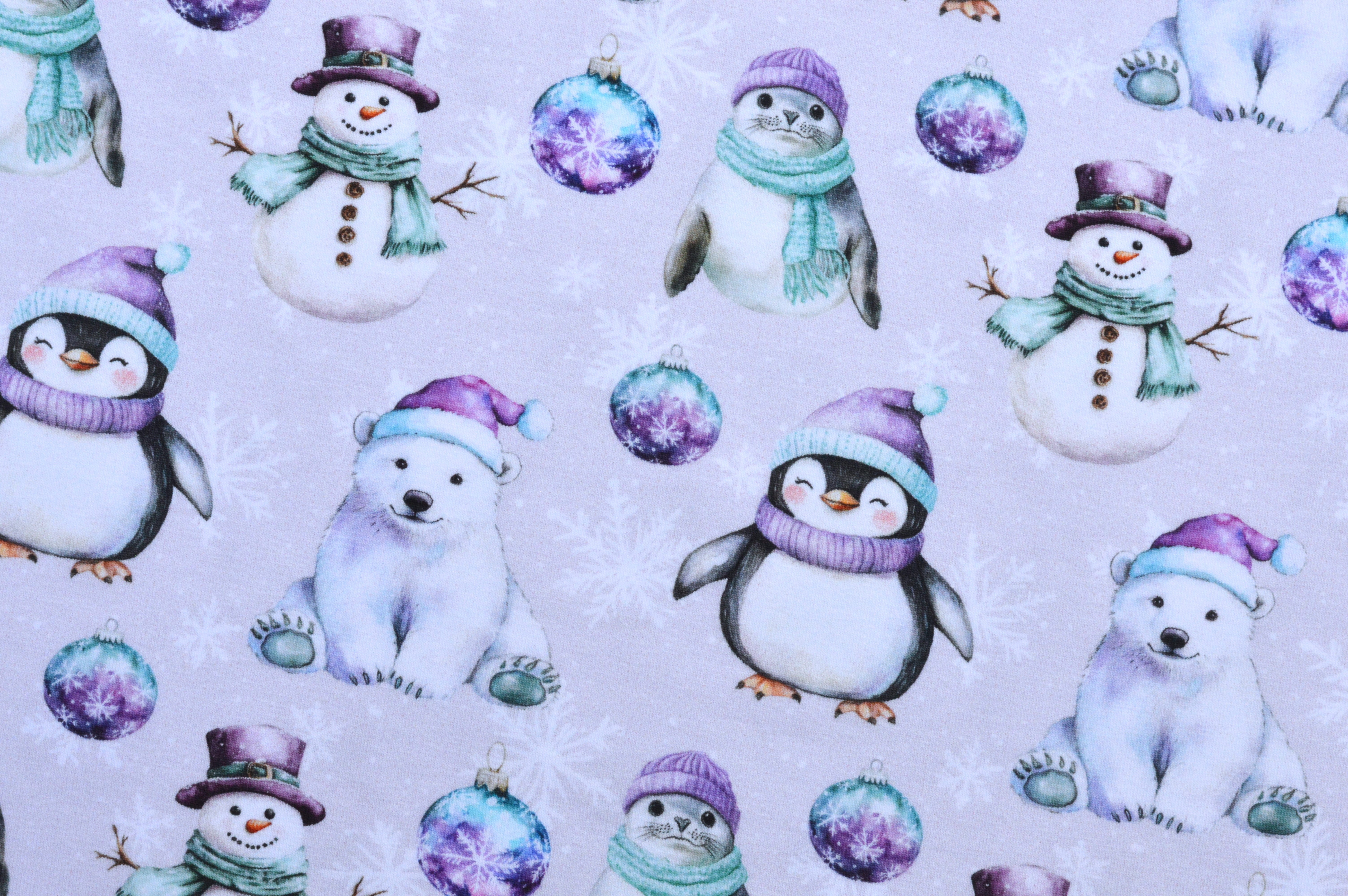 Digitaljersey Eigenproduktion "Winter Friends" mit Wintertieren, Schneemännern und Kugeln auf blassrosa.Über uns
