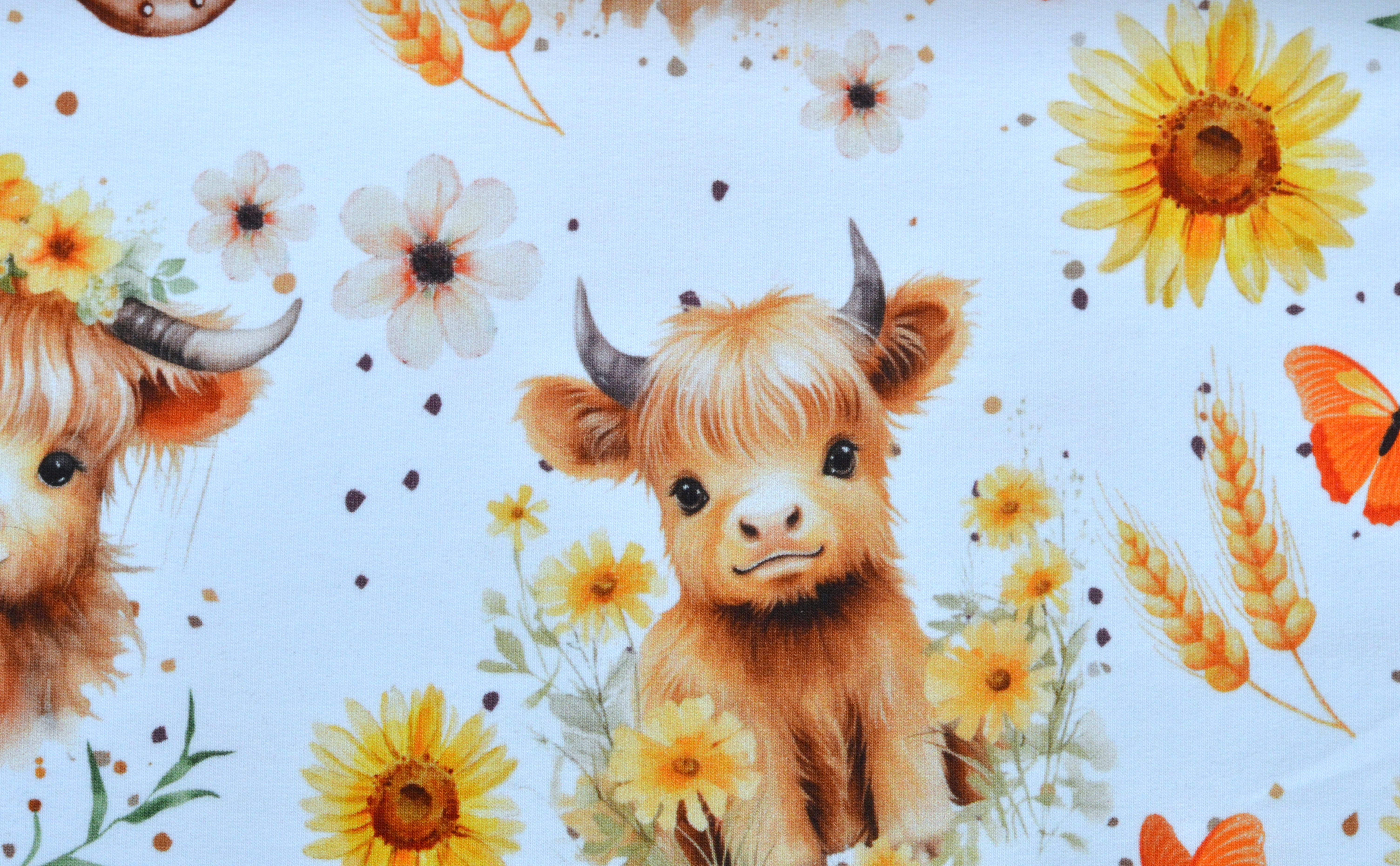 Produktinformationen "French Terry Digital Eigenproduktion "Ida" mit Highland-Kühen und Schmetterlingen - ecru"